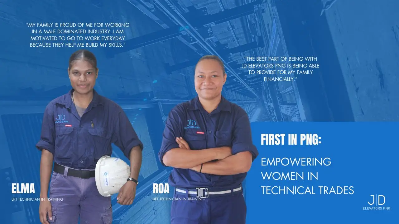Roa and Elma are now the first two female Technicians in Training at JD Elevators PNG, working toward becoming Papua New Guinea’s first qualified female elevator technicians.